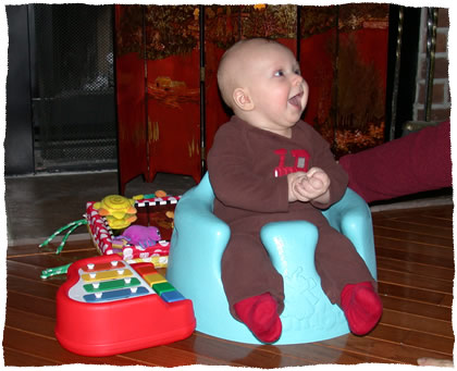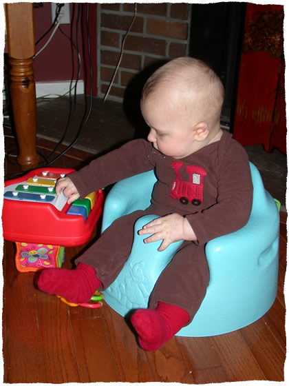 Here are a couple of pictures of Simon sitting in his Bumbo seat. He’s not sure he likes it yet but we’ll keep trying.