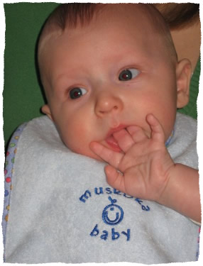 Simon’s started pulling off my glasses when I’m chatting to him or changing him. He’s also fond of pursing his lips and blowing noisy spit bubbles right now. He rolled from tummy to back for the first time last week and he’s working on rolling from back to tummy (apparently more difficult). He gets about 3/4 of the way there and gets stuck.