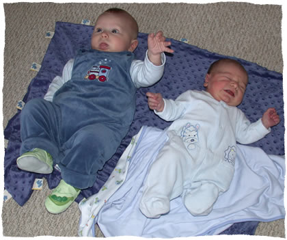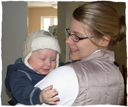 This Monday we visited Hawksley, Laura and Cameron again. My mom came too and she made us a fabulous lunch. Hawksley is changing fast but remains super cute. When I look at Simon it’s hard to believe he was ever Hawksley’s size, but in this picture Hawksley is wearing one of his old sleepers so it must be true.