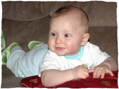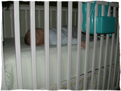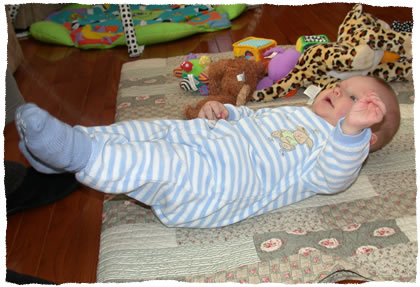 Since he has good head control now (and because our doctor said it was ok) we’ve tried putting Simon to bed on his stomach to see if he’ll sleep any longer. So far it’s hit and miss but he does seem to prefer it.