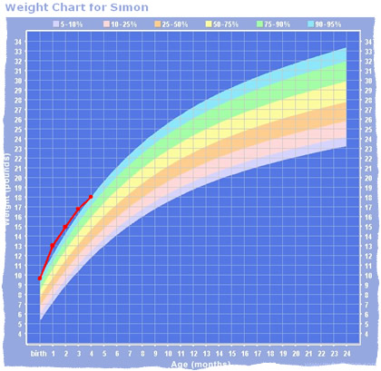 At four months old Simon is now 18 pounds. Here’s a graph that shows what percentile he’s in. As you can see he’s literally off the charts!