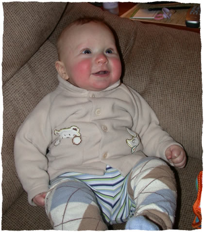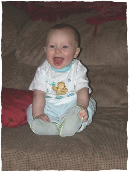 Simon’s able to sit up on his own on soft surfaces like the couch (where we live apparently) or my lap. He can last about five seconds on the floor before he starts toppling over, but I’m pretty sure he’ll be sitting indepedently by six months.