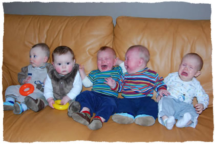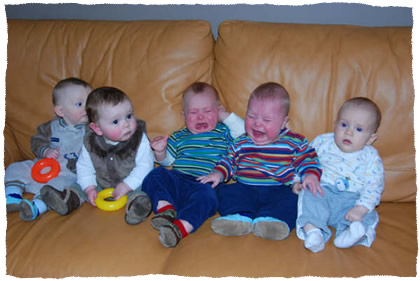 The following sequence of pictures demonstrates this nicely. Our attempt to get a picture of all the boys together went awry when Simon decided he was NOT in the mood to sit still and look cute. Whining was quickly followed by screaming, and by the end of it he had two more babies join his chorus. By the look on his face you would think I was trying to pull his toenails off one by one, not snap a few photos.
