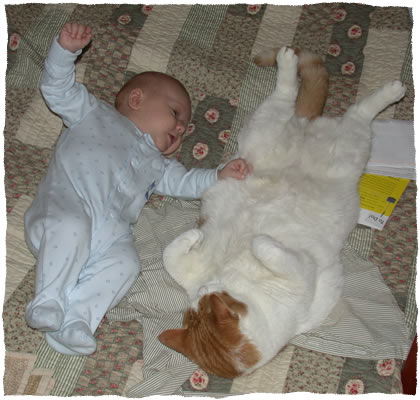 Our cats have finally adjusted to having a baby around. It was mostly the crying that really freaked them out but they’re used to it now. However, Newton is a little jealous of Simon. Sometimes at night he tries to get in between me and Simon when we’re cuddling as if to say “Hey man, I was here first.” Milo and Simon are good buddies though.